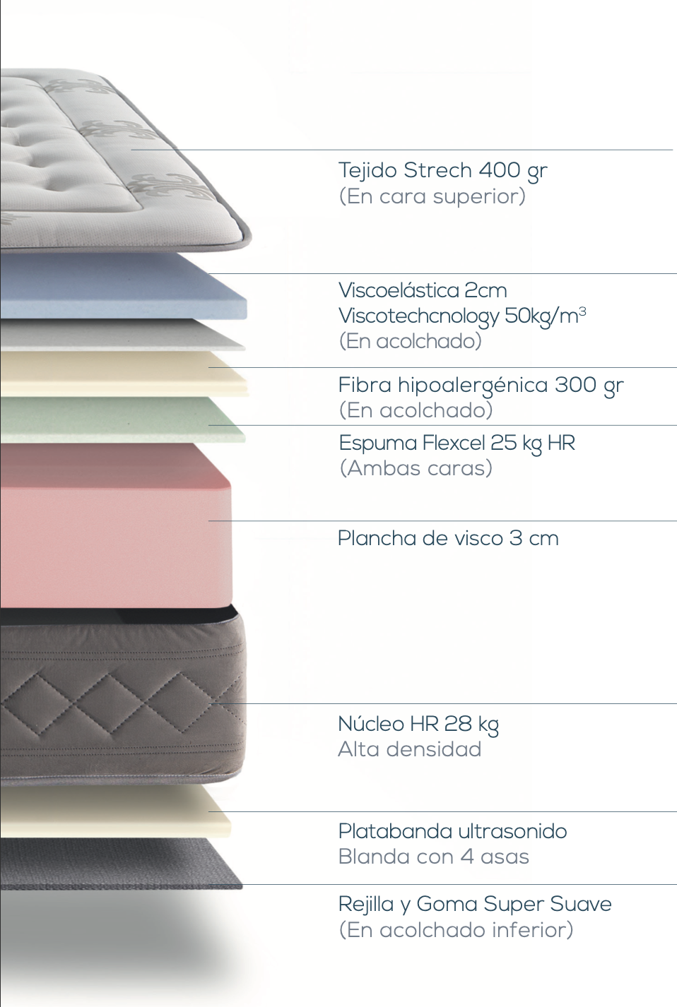 El colchón Flor de Lis HR está pensado para ofrecer un descanso de firmeza media-alta, con gran estabilidad y excelente confort. Su núcleo HR 28 kg de alta densidad proporciona un soporte resistente y duradero, ideal para un uso diario intensivo. Incorpora una acogida superior con viscoelástica 2 cm ViscoTechnology 50 kg/m³ y plancha de visco de 3 cm, adaptándose al cuerpo y mejorando la sensación anatómica. Además, incluye fibra hipoalergénica y tratamiento antiácaros para un descanso más higiénico. Altura aproximada: 30 cm (+/-).