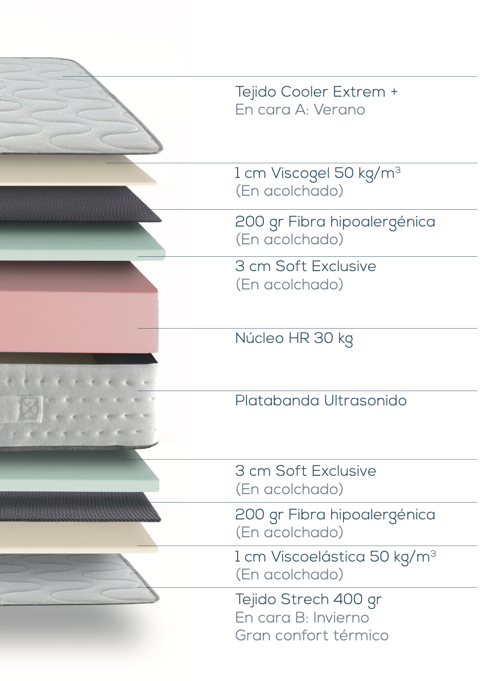 El colchón New Cool versión HR ofrece un descanso cómodo y equilibrado gracias a su núcleo HR 30 kg, ideal para quienes buscan firmeza media con buena adaptabilidad. Incorpora Viscogel 50 kg/m³ y capas Soft Exclusive, que aportan una acogida suave y reducen los puntos de presión. Su diseño de doble cara verano/invierno permite elegir entre mayor frescor o más confort térmico según la época del año. Además, cuenta con tejido Cooler Extrem+ en la cara de verano y tejido Stretch en la cara de invierno. Altura aproximada: 30 cm (+/-) y tratamiento antiácaros.